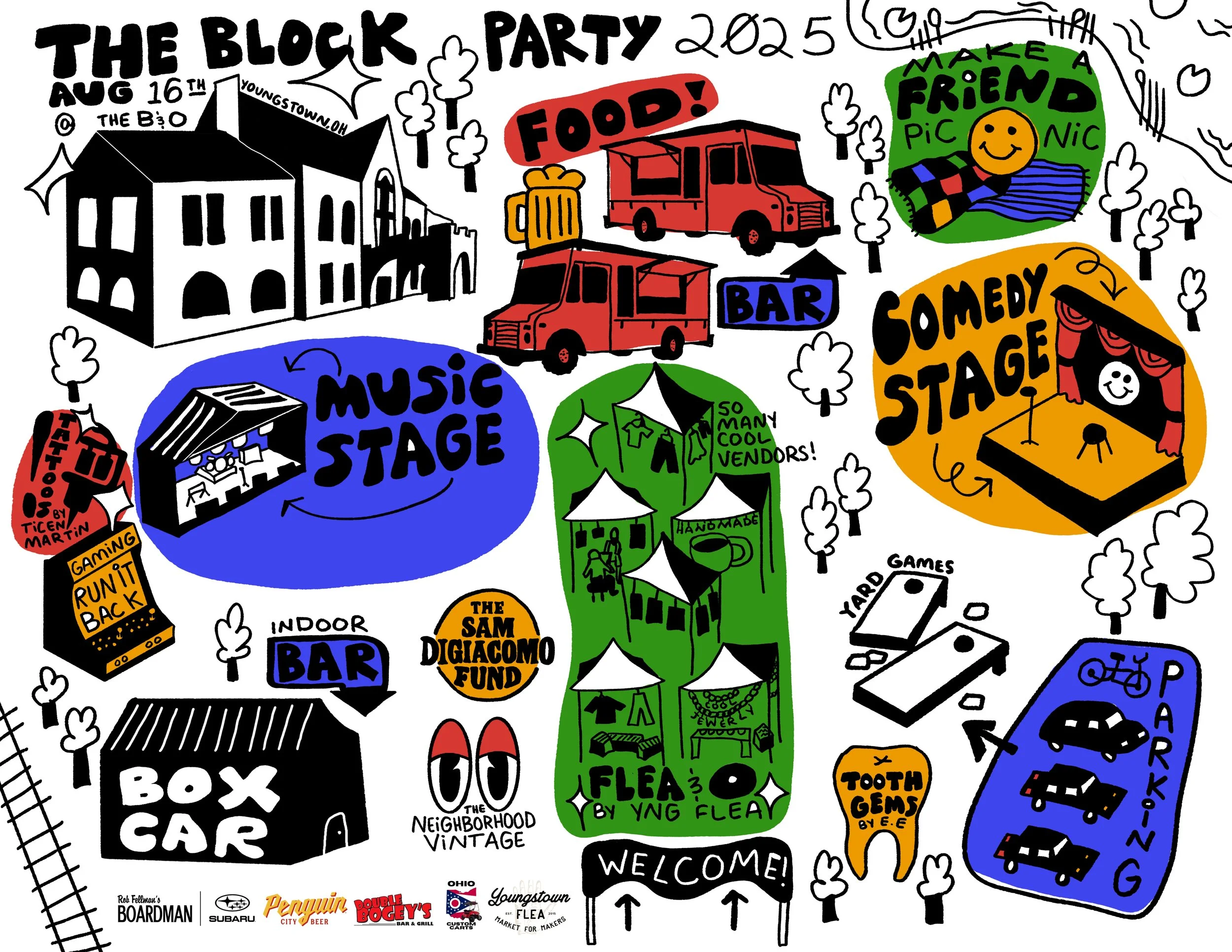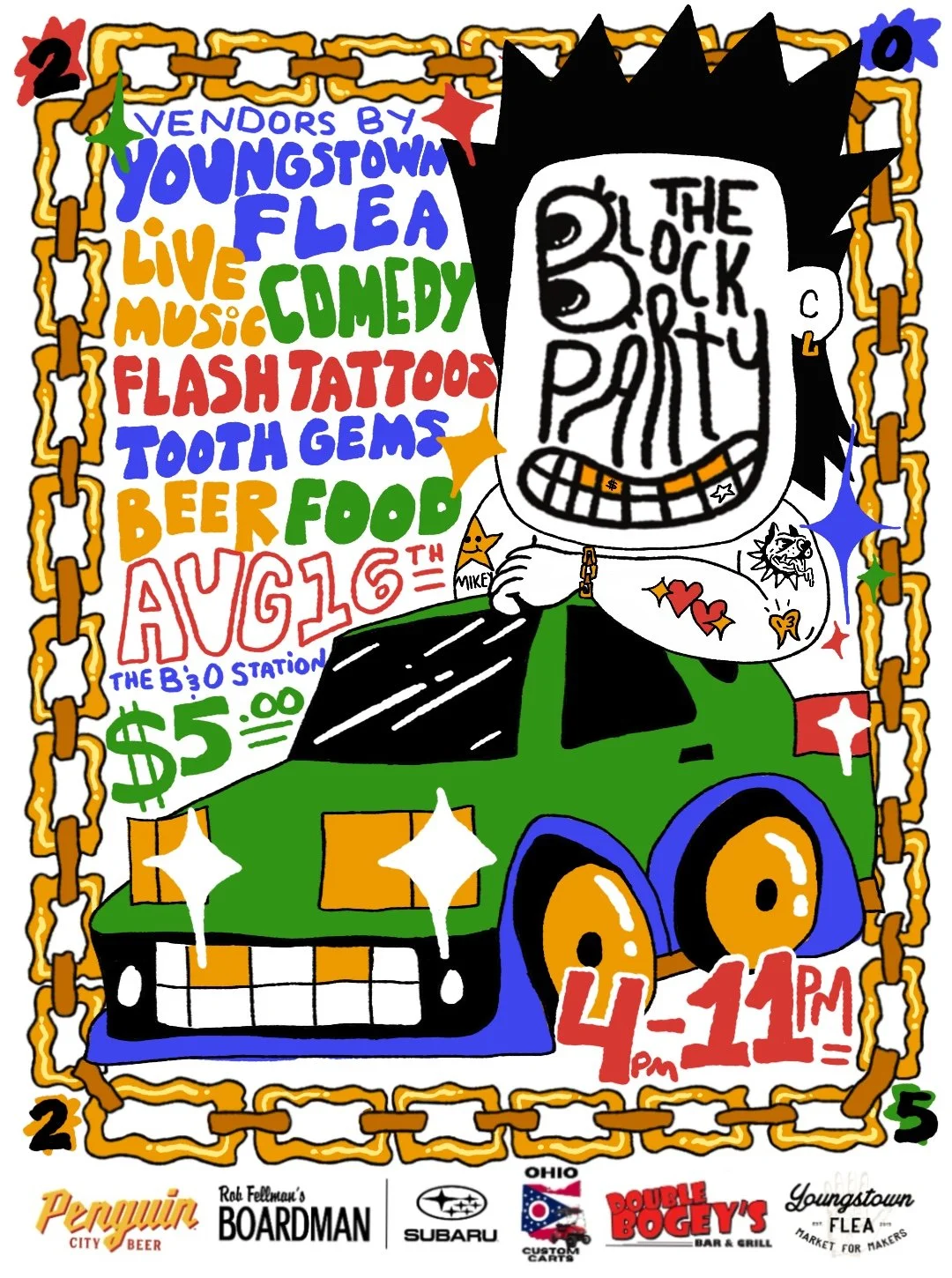 August 16th, 2025 is our 7th year of hosting The Block Party in Youngstown, Ohio. We’re a group of 5 hometown friends who all live in various cities who come home to host a local music and comedy festival once a year every summer. I developed our mascot, Stu, to evolve over time in the same way we would as people. He’s apart of the friend group and we get to go on new adventures with him every year. We started as a hip-hop festival to represent old fashion block parties that one of our friends would go to growing up in the inner city. It represents a community coming together, someone brings the tv outside, another person grills for everyone, and there’s always the best person on music. We’ve taken those vibes and we bring our hometown community together to showcase our city’s music scene, comedians, local food, and local vendors. The hand-drawn illustrative style represents our DIY authentic aesthetic while I get to participate in the block party myself by adding my own style onto the poster as a featured artist! This year, we had tooth gems and flash tattoo artist come so Stu is visually repping those new additions! While Subaru was one of our main sponsors so we had to add a car. Everything is hand-drawn, typography and all. We honor our founding member every year, as he passed away in 2023 and we throw this whole festival for him and his foundation to contribute to the teams that helped take care of him during his sickness. Bog deep! Doing it all for Sam! <3
